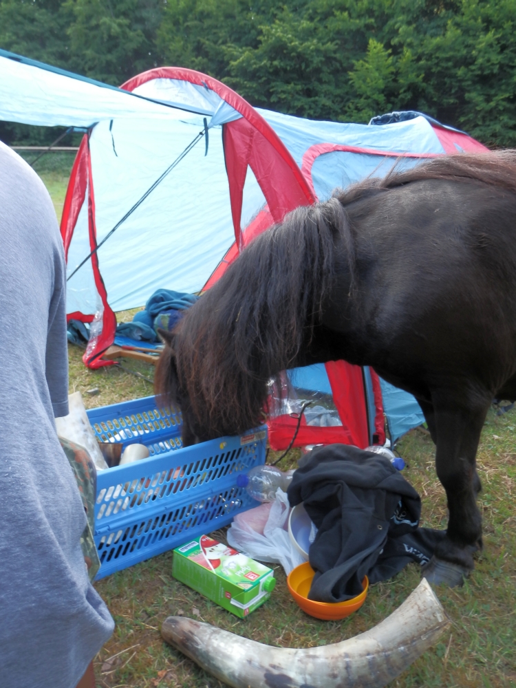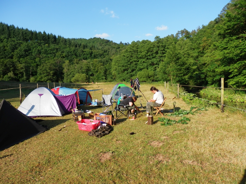 Wir waren acht Männer, Frauen und Kinder. Ort des Geschehens war eine private Wiese in der Eifel. Dort angekommen, trugen wir unser Hab und Gut auf den Platz. Die Wiese liegt abseits vom Ort, eingeschlossen von einem Bach und einem Wald. Leider waren, entgegen der Vereinbarung mit dem Pächter, die Pferde noch auf der Wiese. Aber wir konnten uns gut mit ihnen arrangieren. Lediglich Shelly, das kleine Shetlandpony war manchmal recht penetrant. (Gemüse und Gebildbrot scheinen verlockend auf Ponys zu wirken.)