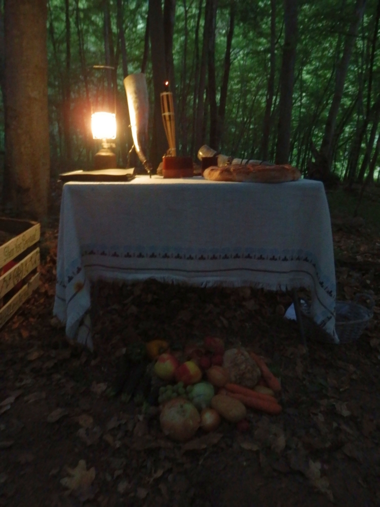 Abends bereiteten wir im angrenzenden Waldstück den Blozplatz vor und besprachen den Ablauf. Wir integrierten auf Wunsch einige hexische Elemente. Dem Gesamtbild hat das gut getan und es unterstreicht die glaubensübergreifende Gruppenzugehörigkeit aller. Gegen 22 Uhr begann das Bloz. Nach der Platzweihe und Anrufen der Elemente und Götter, insbesondere Balder und Sunna, Frea, Donar und Njord, Gott und Göttin, opferten wir Trank und das Gebildbrot in Form eines Sonnenrades. In der dann anschließenden ruhigen Phase opferten einige persönliche Dinge und schickten Gedanken und Bitten mit auf den Weg. Die anwesenden Paare bekundeten ihre Liebe und Treue untereinander. Neben meinem neuen/ersten Ritualhammer ließ Skallvadr ein Schutzamulett für einen schwerkranken Angehörigen weihen. Darauf folgte ein sehr bewegendes und mitreißendes Sumbel. Schließlich wurde das Ritual geschlossen, wir löschten das Feuer und kehrten zum Lagerplatz zurück. Dort unten am Bach entzündeten wir das gefertigte Sonnenrad, erhoben es gen Himmel und warfen es in die Salm.